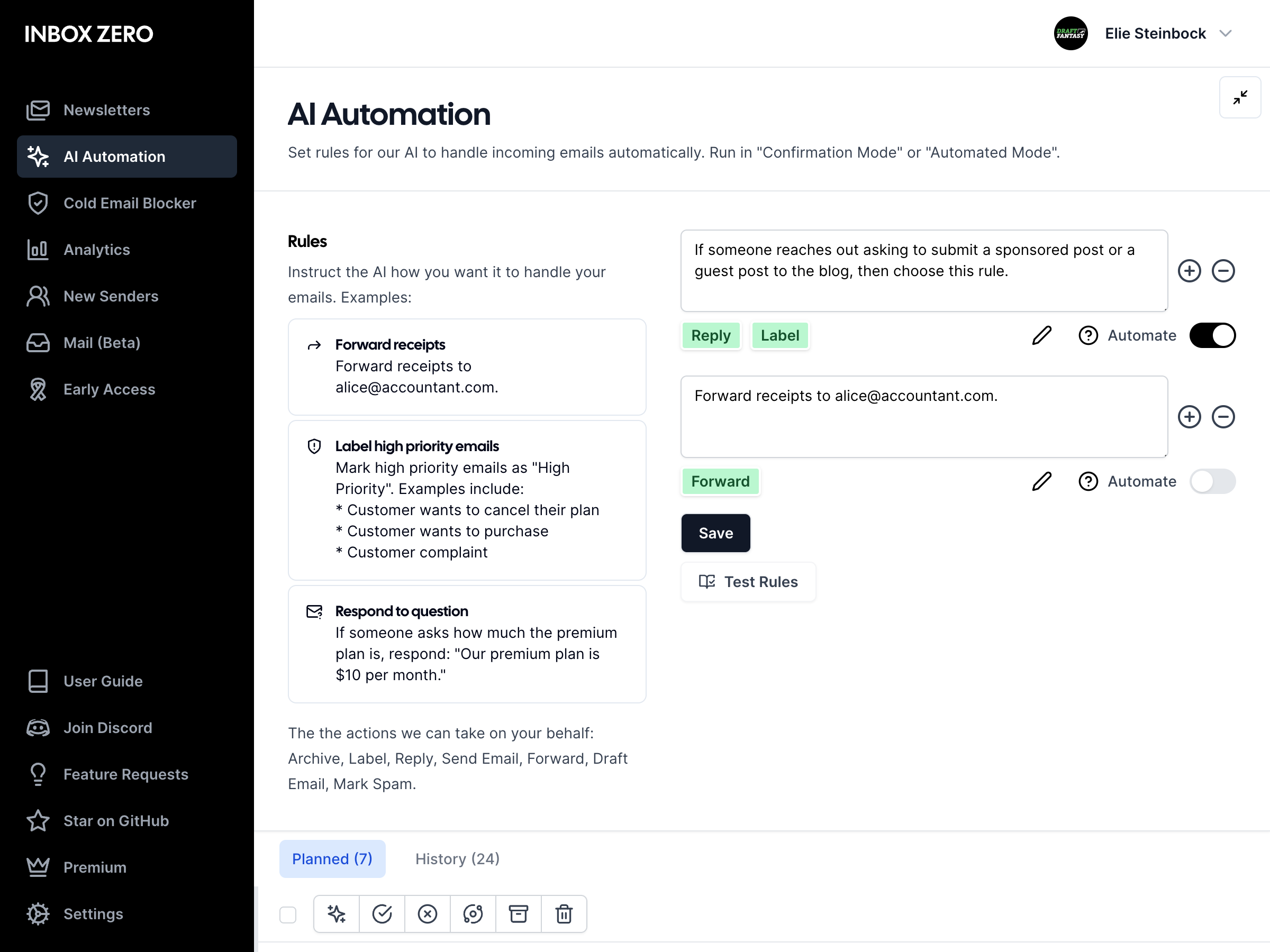 Your AI agent can reply, forward, archive, and label emails based on the rules you provide it.