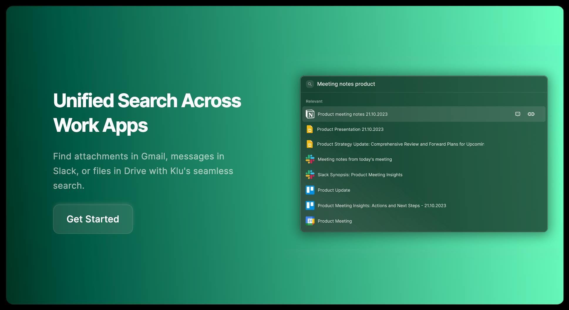 Are you seeking a smarter way to manage and search your digital information? Klu unifies Emails, Messages, and Docs effortlessly. Whether it's attachments in Gmail, wikis in Notion, messages in Slack, or documents in Drive, Klu provides seamless search across all your apps.