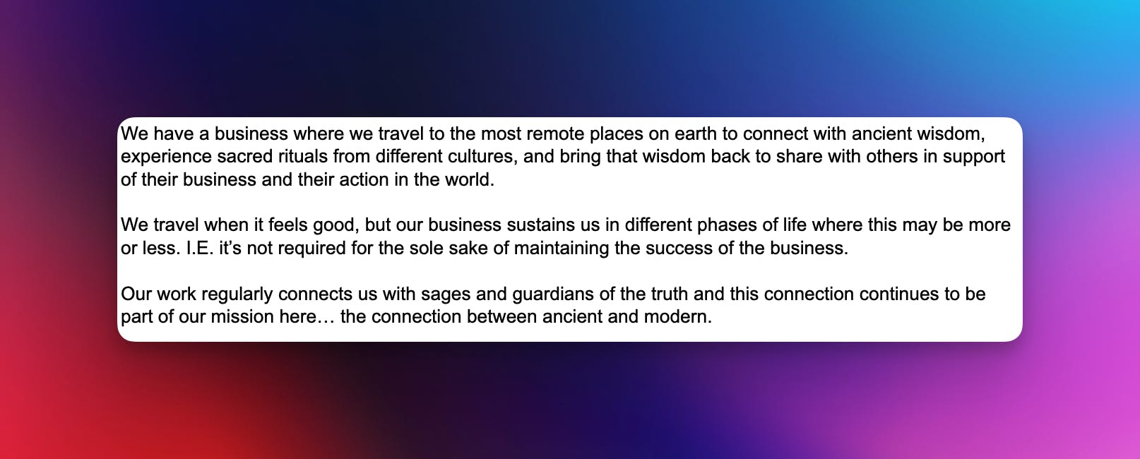 - Read the Sacred Business Manifesto (Free): Learn the core principles of building a Sacred Business through our founding story and framework. See how we transformed our approach to business by understanding that everything is connected.
